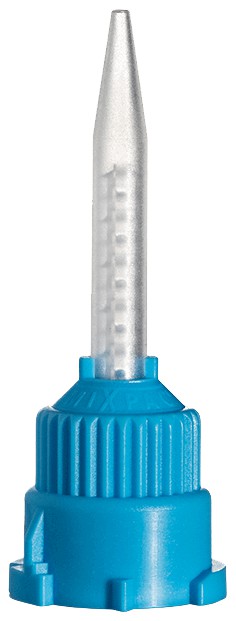 A Ponta misturadora MIXPAC T-Mixer que possue sua base na cor azul, com o elemento de mistura transparente, é indicada para resinas bisacrílicas e silicone de modelo.